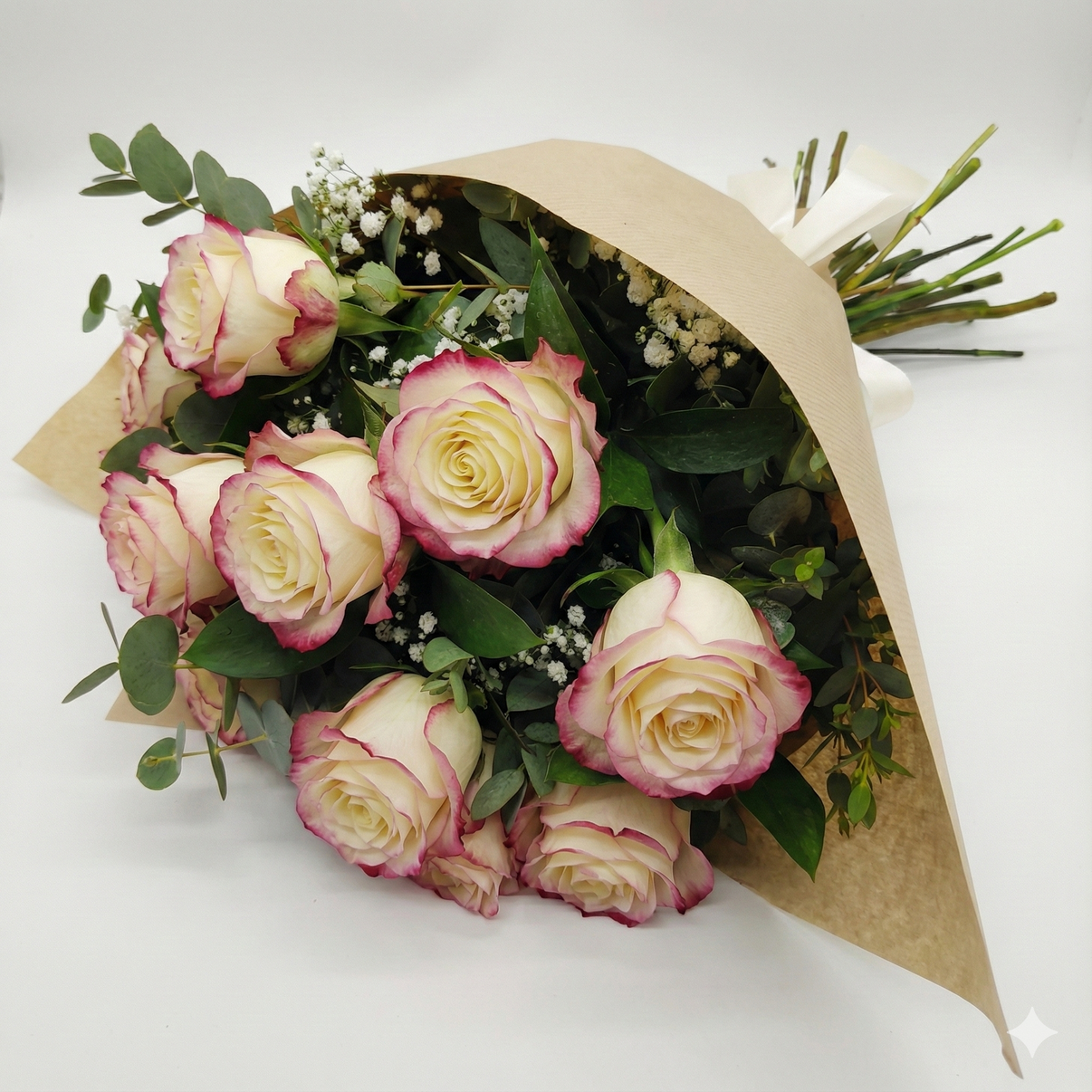 Un kit floral delicado y elegante, con rosas en tono crema y borde rosado, verdes frescos y un toque de paniculata. Ideal cuando quieres acertar con un regalo fino, romántico y luminoso.