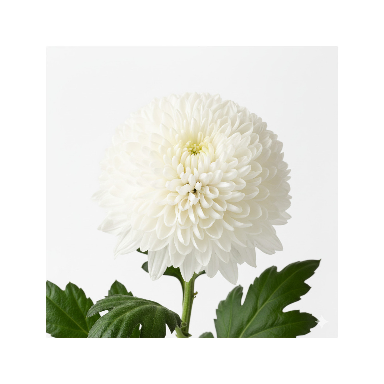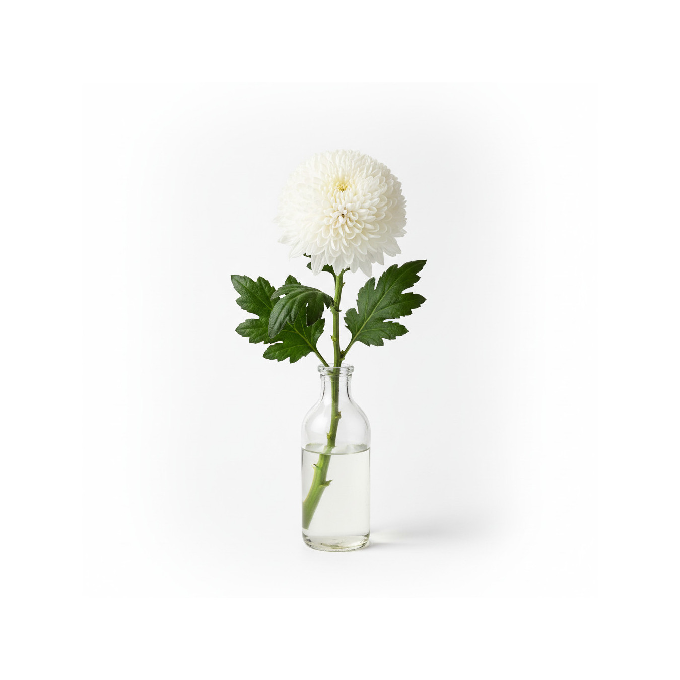 Tallo único de crisantemo Pin Pon blanco, cultivado en Andalucía por agricultores especializados en flor cortada de alta calidad. Esta variedad destaca por su forma redondeada y compacta, y por su tono blanco puro, que transmite serenidad y elegancia.