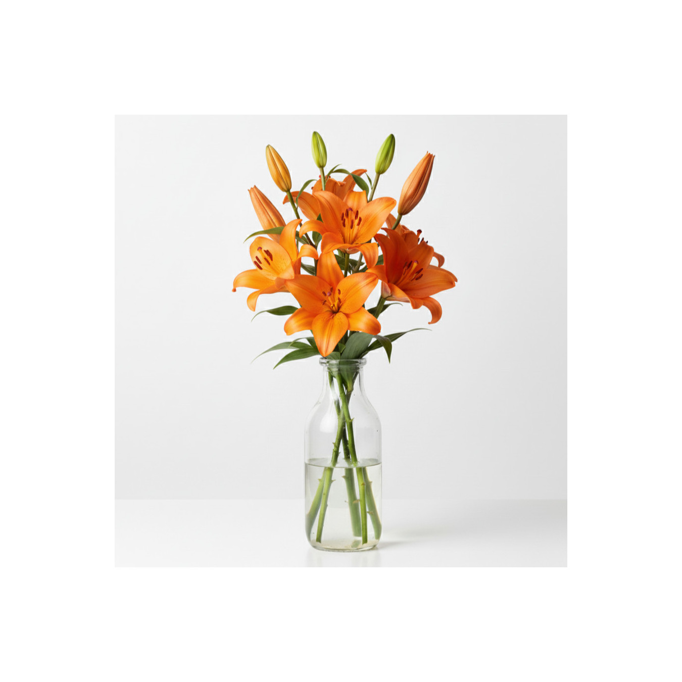 Este artículo incluye 5 tallos de lilium Naranja, procedentes de cultivos nacionales en Murcia y Chipiona, zonas con gran tradición en flor cortada. El lilium es una flor que destaca por su porte elegante, sus pétalos amplios y su aroma suave y envolvente.