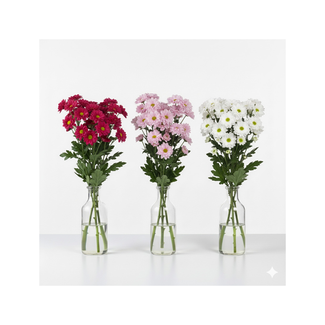Este pack reúne margaritas en tres colores elegantes: blanco, rosa y rosa oscuro, creando una combinación sobria y equilibrada perfecta para composiciones que quieran destacar y aportar vida.